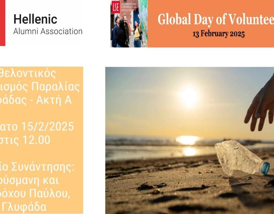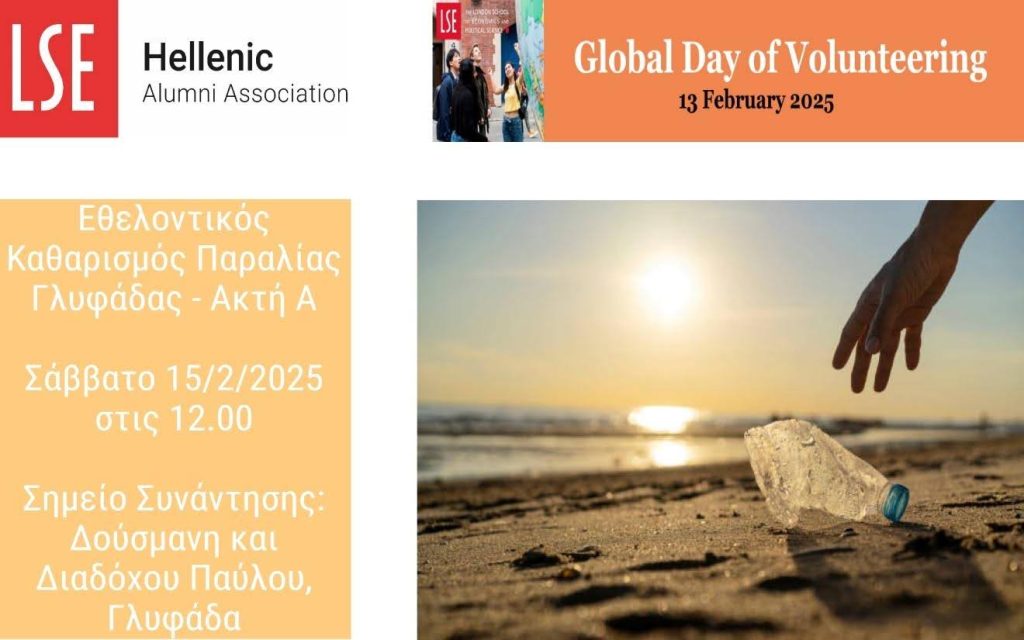 13 Φεβρουαρίου, 2025 13 Φεβρουαρίου, 2025Categories Εκδηλώσεις ΝέαΣτα πλαίσια του Global Day of Volunteering του LSE που θα διεξαχθεί σε πολλές πόλεις ανα τον κόσμο και φυσικά στην Αθήνα, ο Ελληνικός Σύλλογος Αποφοίτων του LSE σας προσκαλεί το Σάββατο 15/2/2025 στις 12.00 σε εθελοντικό καθαρισμό της Παραλίας της Γλυφάδας – Ακτή Α.