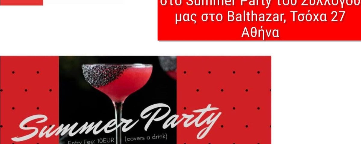 Σας περιμένουμε με χαρά αυτή την Τετάρτη 16 Ιουλίου στις 20.30 στο Summer Party του Συλλόγου μας στο Balthazar, Τσόχα 27 Αθήνα. 10 ευρώ το ποτό. Θα χαρούμε πολύ να σας δούμε, να περάσουμε όμορφα και να ανταλλάξουμε ευχές για ένα όμορφο και ξεχωριστό καλοκαίρι